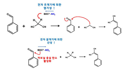 이번 연구는 금속유기구조체(MOF), 그중에서도 안정성이 높아 다양한 응용 연구의 출발점으로 널리 활용되는 UiO-66 계열을 바탕으로 진행되었습니다. 학생들은 UiO-66의 골격을 기반으로 작용기를 달리한 유도체들을 마련하고, 그 차이가 Knoevenagel 축합 반응에서 어떤 반응성의 차이를 만들어내는지 확인하고자 했습니다. 다시 말해 같은 뼈대, 다른 작용기를 비교하는 연구였습니다. 같은 구조를 공유한다는 점은 실험을 단순하게 만들지 않습니다. 오히려 그만큼 미세한 차이를 잡아내야 하기에, 더 엄격한 통제와 더 정직한 해석이 요구됩니다.