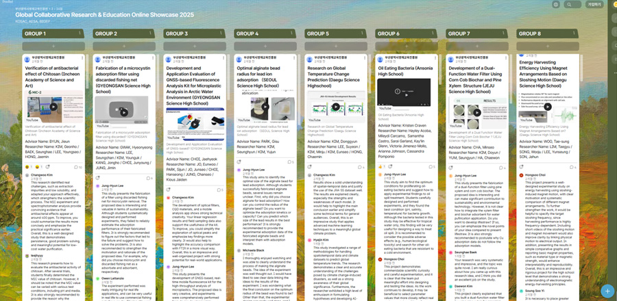12월에 진행된 온라인 성과교류회(Padlet 활용)에서는 총 8개의 그룹 25개팀이 화학, 물리부터 사회과학에 이르는 다양한 주제의 연구결과를 영어로 발표하였다. 모든 학생이 발표에 참여하며 긴밀히 협력했고, 여러 컨설턴트들의 다각적인 온라인 피드백을 통해 자신의 연구를 객관적으로 바라보는 안목을 길렀을 것이라 확신한다.